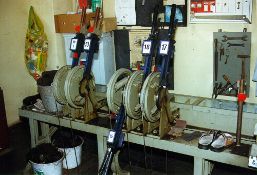 Linker Teil der Hebelbank mit den Weichenhebeln. Ansonsten zeigt die Aufnahme alles, was sonst noch für den Stellwerksdienst