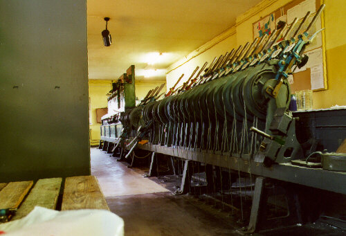 Hebelbank des Einheitsstellwerks kurz vor der Außerbetriebnahme des S-Bahn-Teils (für dessen Signale noch ein GS-Pult