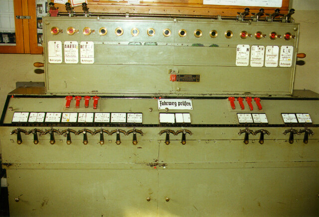 Befehlswerk, für die Befehlsabgabe ist keine Zustimmung durch den jeweils anderen Wärter notwendig, daher das Hinweisschild "Fahrweg prüfen" in der Mitte des Befehlswerks.