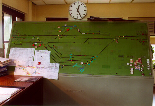 Im Stellwerksraum befindet sich zusätzlich eine Meldetafel zur Gleisbesetzt-, Fahrstraßen- und Weichenlagenanzeige.